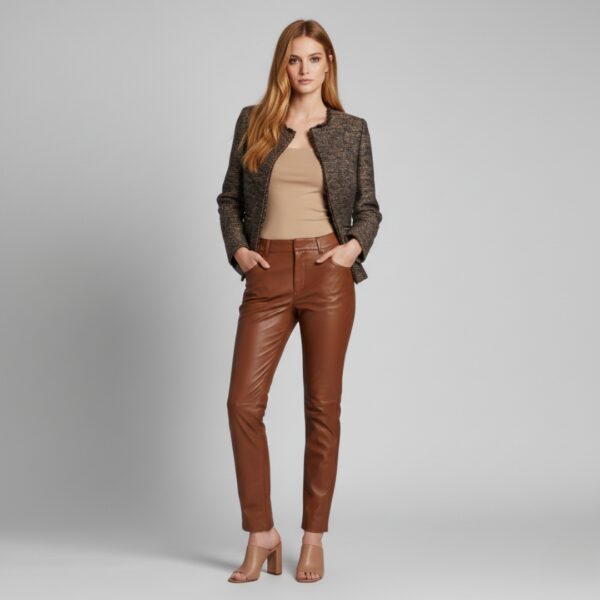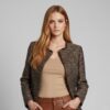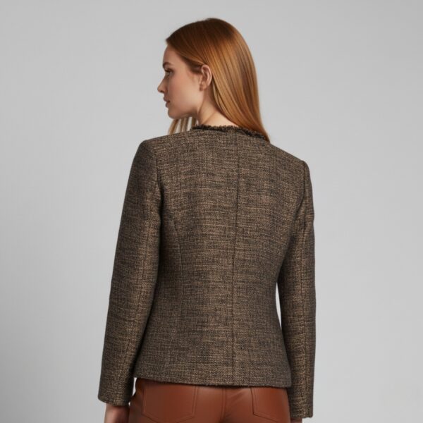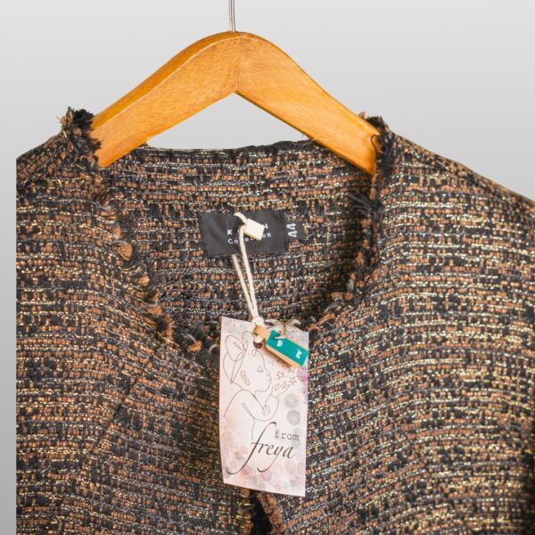 Aurelia is a tweed-style blazer woven in black with fine golden threads, giving a soft shimmer rather than a shine. The collarless cut and frayed edges keep it modern and relaxed, while the structure adds just enough polish for meetings, dinners or evenings out.