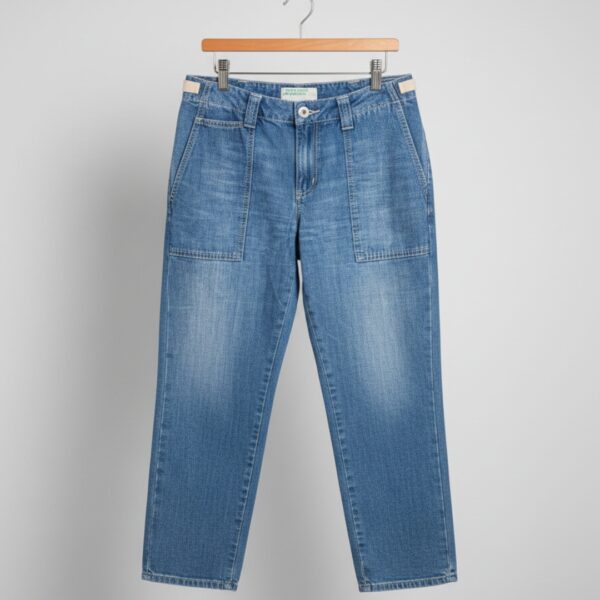 Azure Benetton Jeans come in a soft mid‑blue wash with generous front patch pockets and a straight, relaxed leg. They have that lived‑in feel that works for real life – comfortable enough for busy days, still neat enough for a casual office.