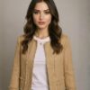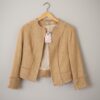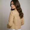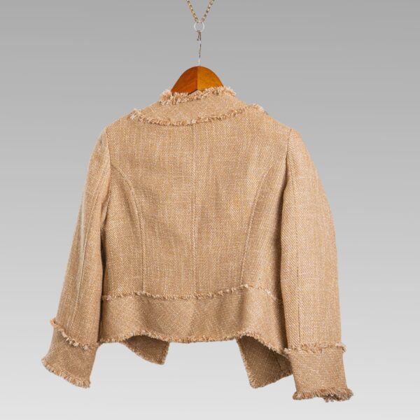 Camille is a beige, textured blazer with frayed edges that give it a relaxed, modern twist. The collarless, open-front shape sits neatly over dresses, denim, or tailored trousers adding quiet structure without feeling strict.