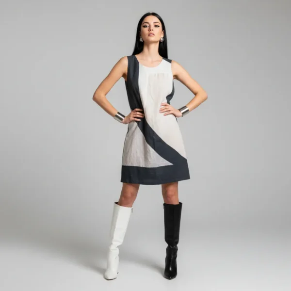 Chiaroscuro Dress is a sleeveless shift in black and ivory, with a sweeping diagonal stripe that feels like a brushstroke across the body. The silhouette is clean and uncomplicated, so it can be worn comfortably while still looking intentional.