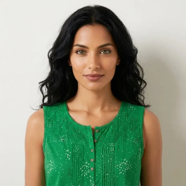 Evergreen top was chosen for its quiet brightness and ease. With its fresh green shade, it lifts up any outfit effortlessly without asking for attention. It feels light, breathable on the skin – comfortable on warm days, and easy to layer when weather changes.