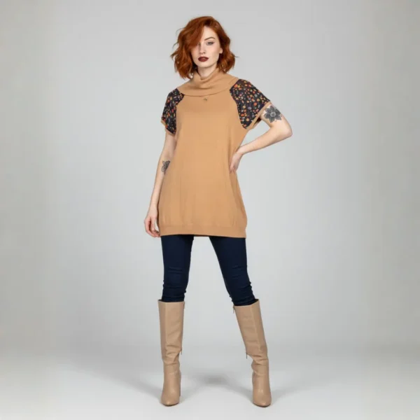 Hazel is a soft beige tunic with a cosy funnel neck and gently fitted shape, balanced by short sleeves in navy fabric scattered with tiny, colourful dots. The contrast sleeves add a quiet playfulness while the body stays calm and neutral.