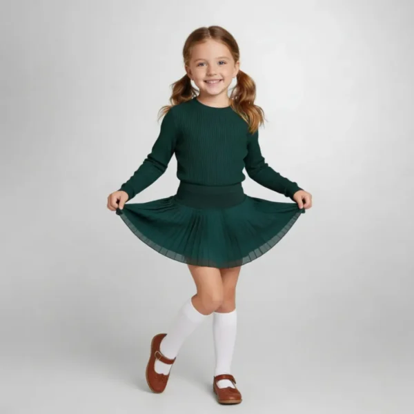 Ivy is a deep green pleated skirt with a soft, stretchy waistband that’s gentle on little tummies and easy for small hands to pull on and off. The light, swishy pleats move beautifully when she runs or twirls. This essential piece is comfortable enough for every day.