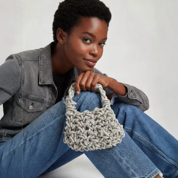 Luna is a handmade bag from glittering silver cord, woven into a chunky, sculptural shape that feels like carrying a piece of night sky. The texture is bold, yet the colour keeps it calm, shining gently.