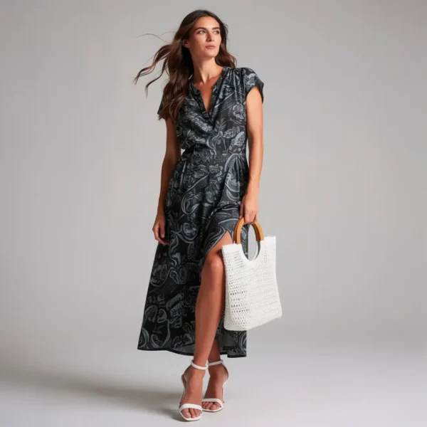That’s how we could describe our Midnight Maxi Dress. The dark base keeps it grounded, white the blue pattern adds an intriguing, interesting note.
