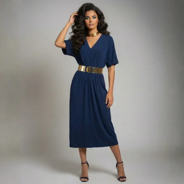 Nerina is a deep blue dress with a simple V‑neckline, loose sleeves, and an easy straight cut that falls gently without clinging. It’s the kind of piece you can slip into on busy mornings or slow evenings and feel comfortable, covered, and quietly put together.
