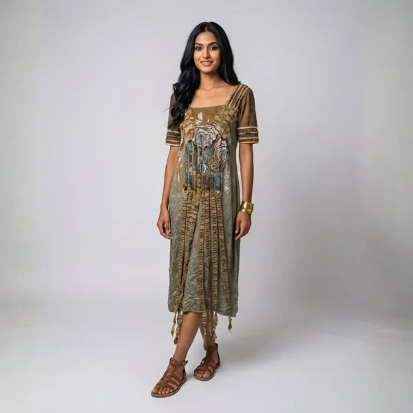 Solstice is a boho‑inspired dress in mossy greens and warm browns, with painted motifs front and back and striped details along the neckline and sleeves. The fabric has a softly crinkled texture, and the hem finishes in narrow, twisted points that move with every step.