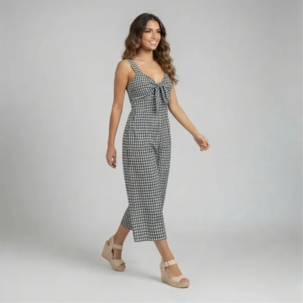 Vichy is a black‑and‑white gingham jumpsuit with wide straps and a gentle tie at the bust, giving shape without feeling tight. The bottom pants fall in an easy line, light enough for warm days and simple to move in – perfect for picnics, weekends away, or everyday errands that still deserve something pretty.